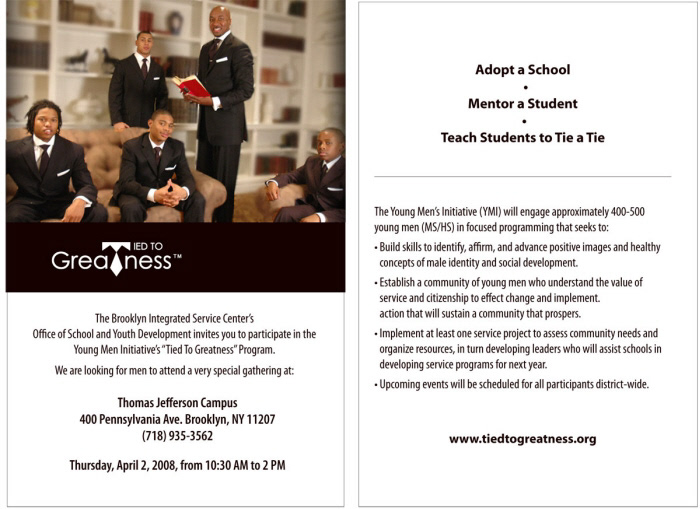 Invitation to join the "Tied to Greatness" program, created for middle and high school students, sponsored by the Young Men's Initiative (YMI).